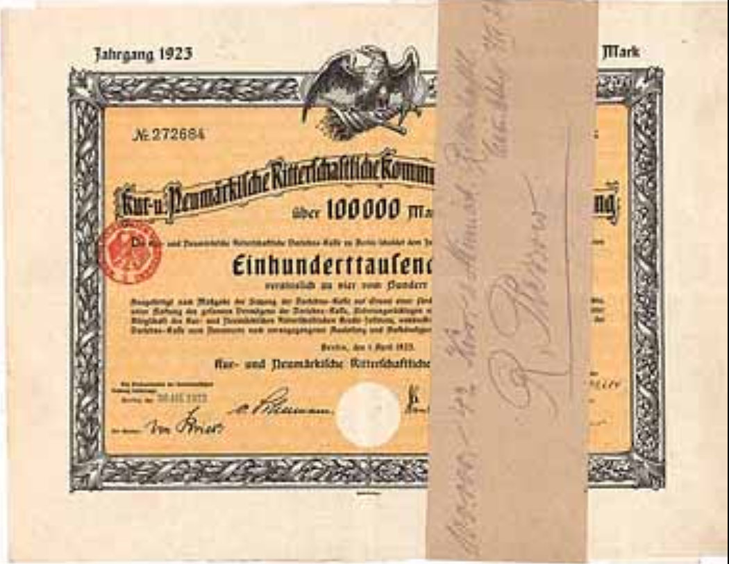 100.000 Mark; Kur- und Neumärkische Ritterschaftliche 4% Kommunal-Schuldverschreibung; ausgestellt in Berlin, am 1. April 1923; nicht katalogisiert; Wz.: ; Drfa.: Reichsdruckerei |