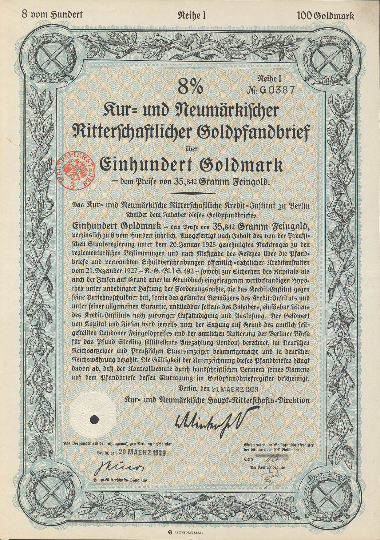 100 Goldmark; 8% Goldpfandbrief; Kur- und Neumärkische Ritterschaftliches Kredit-Institut; ausgestellt in Berlin, am 20. März 1929; nicht katalogisiert; Lochentwertet; Drfa.: Reichsdruckerei |