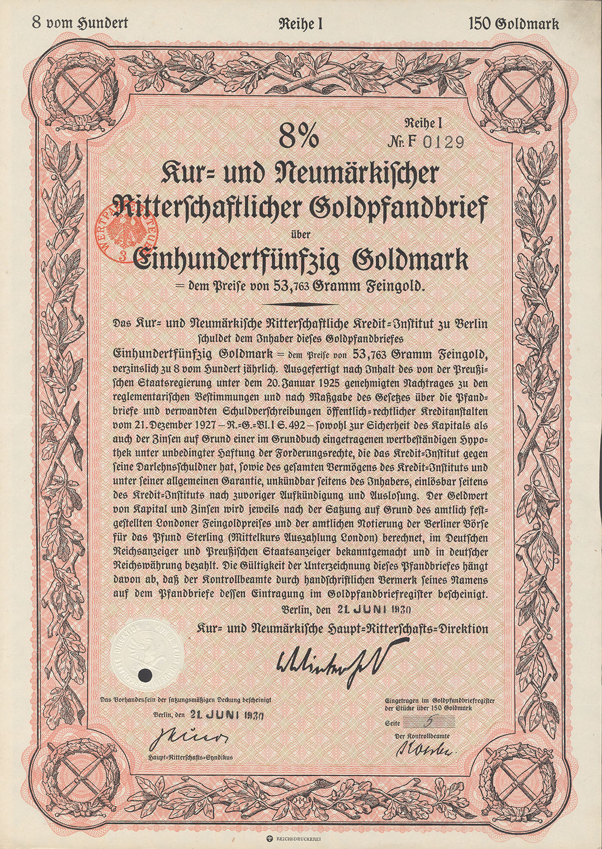 150 Goldmark; 8% Goldpfandbrief; Kur- und Neumärkische Ritterschaftliches Kredit-Institut; ausgestellt in Berlin, am 21. Juni 1930; nicht katalogisiert; Wz.: Kreuzblumenmuster; Lochentwertet; Drfa.: Reichsdruckerei |