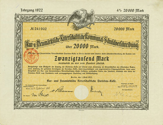 20.000 Mark; Kur- und Neumärkische Ritterschaftliche 4% Kommunal-Schuldverschreibung; ausgestellt in Berlin, am 1. April 1922; nicht katalogisiert; Wz.: ; Drfa.: Reichsdruckerei |