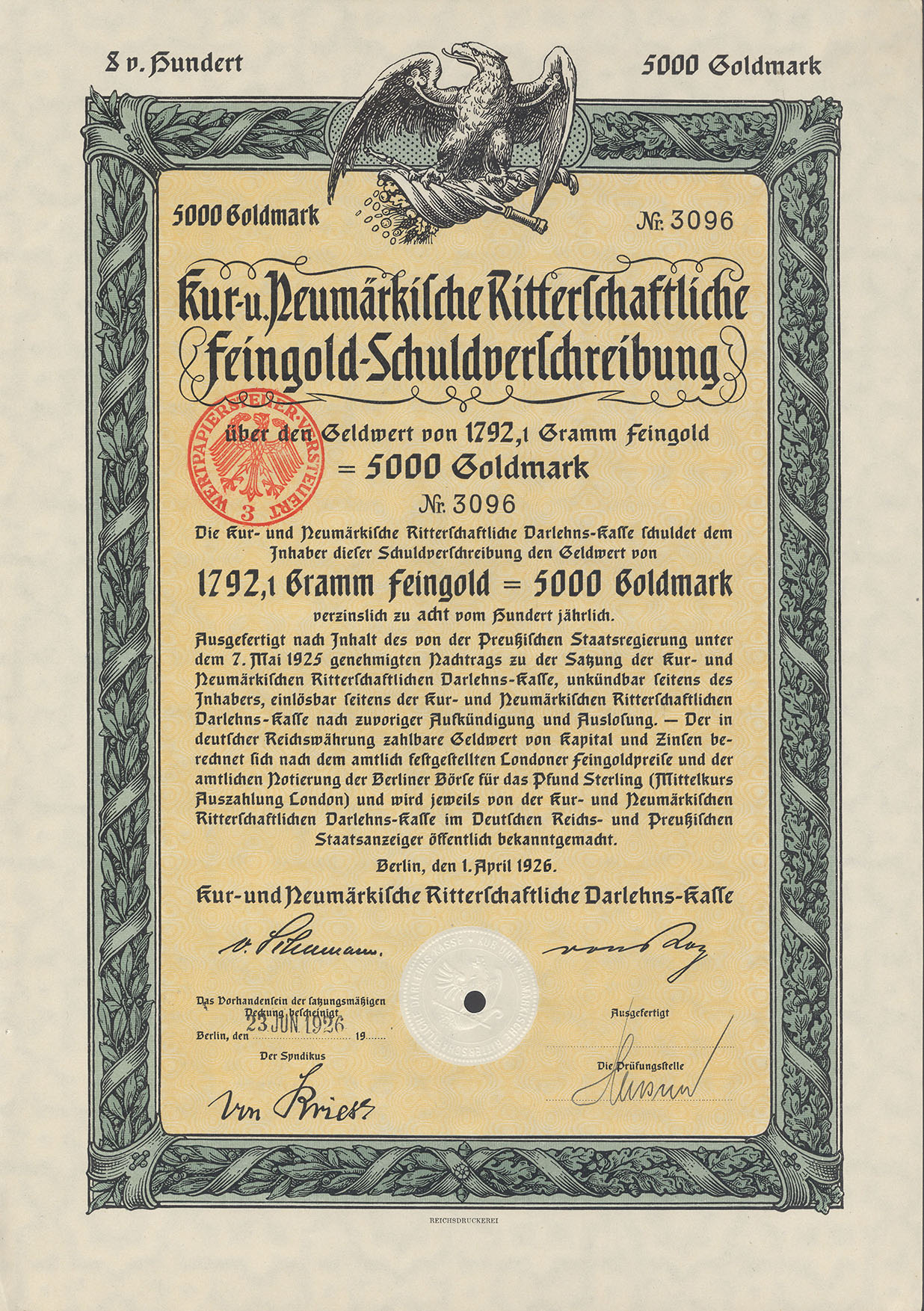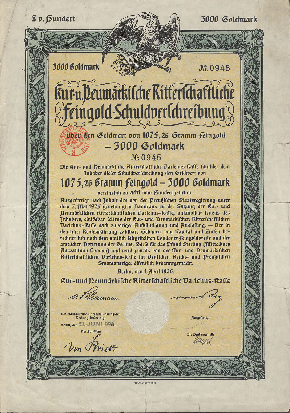 3000 Goldmark; Kur- und Neumärkische Ritterschaftliche 8% Feingold-Schuldverschreibung; ausgestellt in Berlin, am 1. April 1926; nicht katalogisiert; Lochentwertet; Drfa.: Reichsdruckerei |