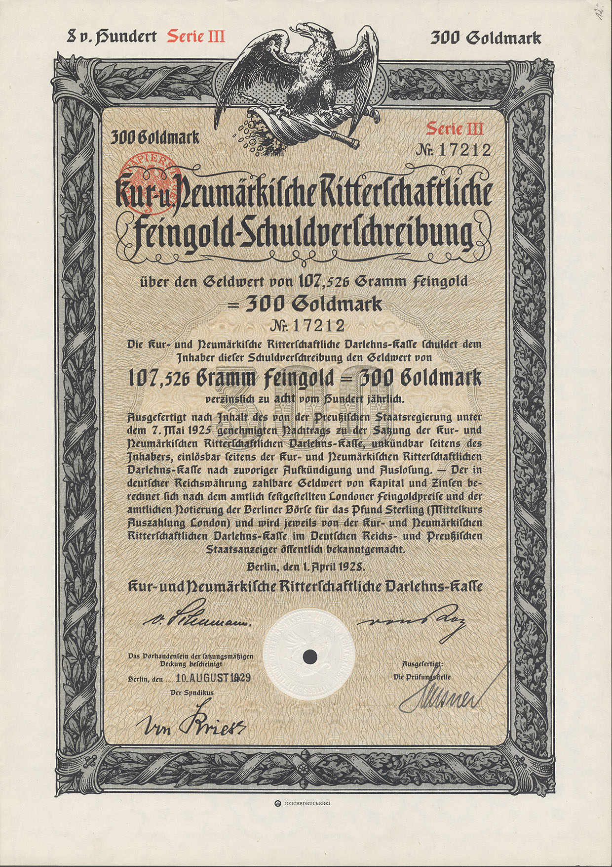 300 Goldmark; 8% Goldpfandbrief; Kur- und Neumärkische Ritterschaftliches Kredit-Institut; ausgestellt in Berlin, am 1929; nicht katalogisiert; Wz.; Lochentwertet; Drfa.: Reichsdruckerei |
