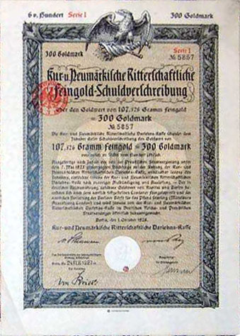 300 Goldmark; Serie I; Kur- und Neumärkische Ritterschaftliche 6% Feingold-Schuldverschreibung; ausgestellt in Berlin, am 1. Oktober 1926; nicht katalogisiert; Wz.: Kreuzblumenmuster; Lochentwertet; Drfa.: Reichsdruckerei |