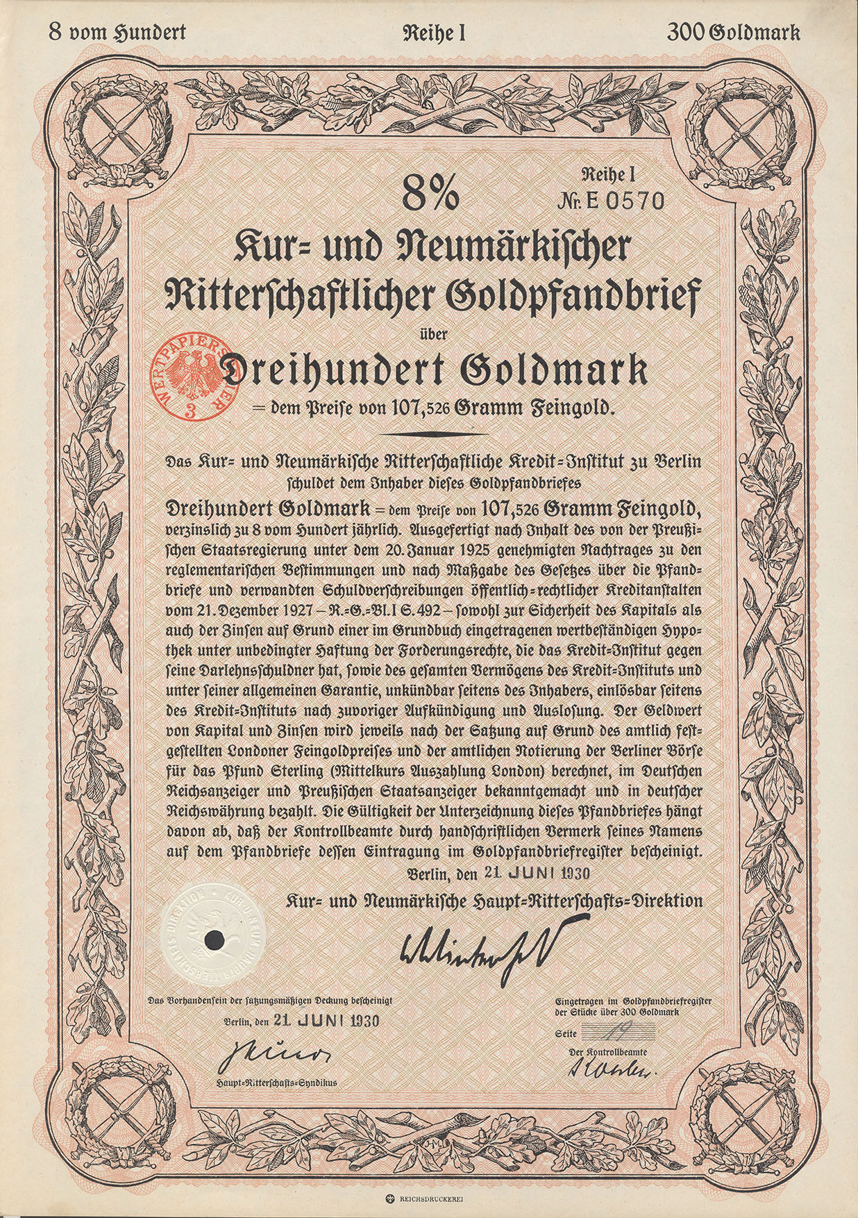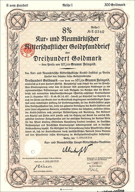 300 Goldmark; 8% Goldpfandbrief; Kur- und Neumärkische Ritterschaftliches Kredit-Institut; ausgestellt in Berlin, am 21 Juni 1930; nicht katalogisiert; Wz.: Kreuzblumenmuster; Lochentwertet; Drfa.: Reichsdruckerei |