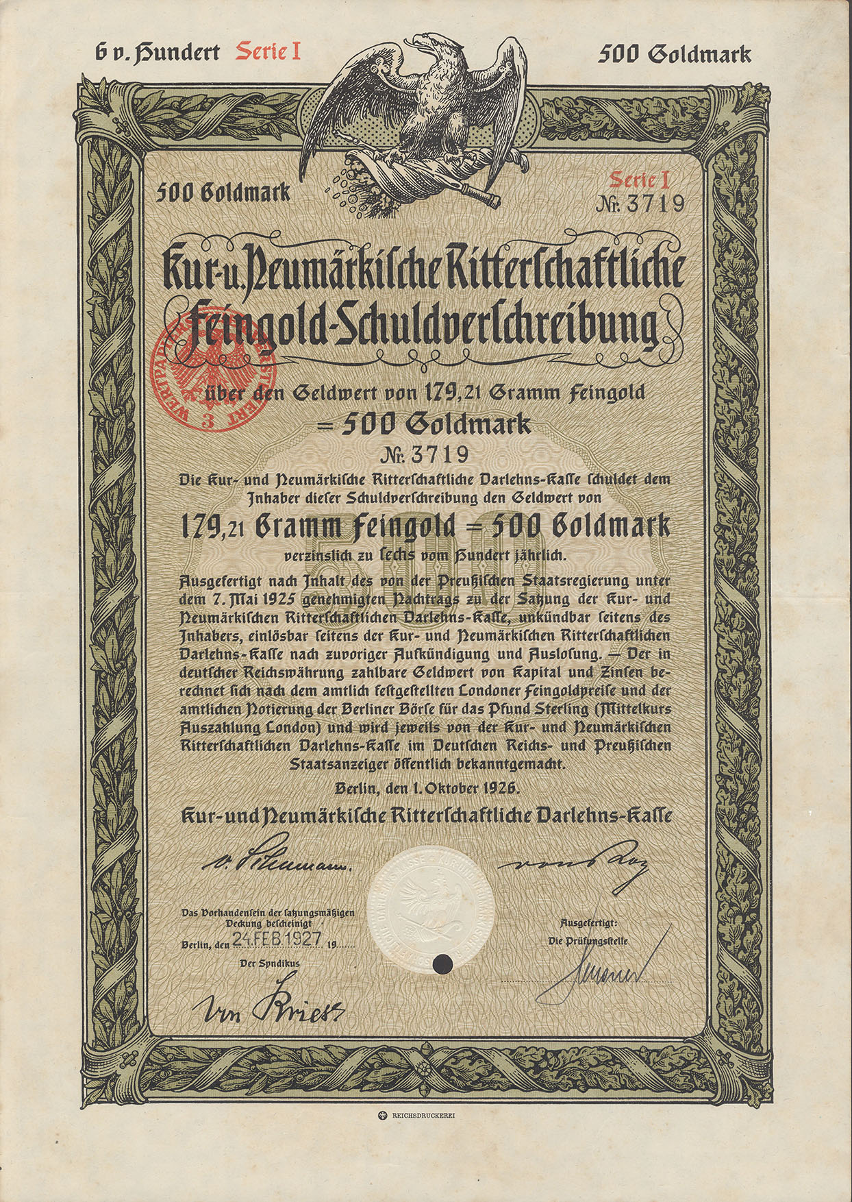 500 Goldmark; Serie I; Kur- und Neumärkische Ritterschaftliche 6% Feingold-Schuldverschreibung; ausgestellt in Berlin, am 1. Oktober 1926; nicht katalogisiert; Wz.: Kreuzblumenmuster; Lochentwertet; Drfa.: Reichsdruckerei |