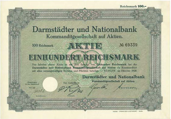 100 Reichsmark; Darmstädter- und Nationalbank KgA; ausgestellt in Berlin, im Oktober 1928; SUPPES 2005/06-4383; Auflage 100.000 Stück; Drfa.: Giesecke & Devrient, Leipzig; R10 (bekannt sind nur 3 Stück) |