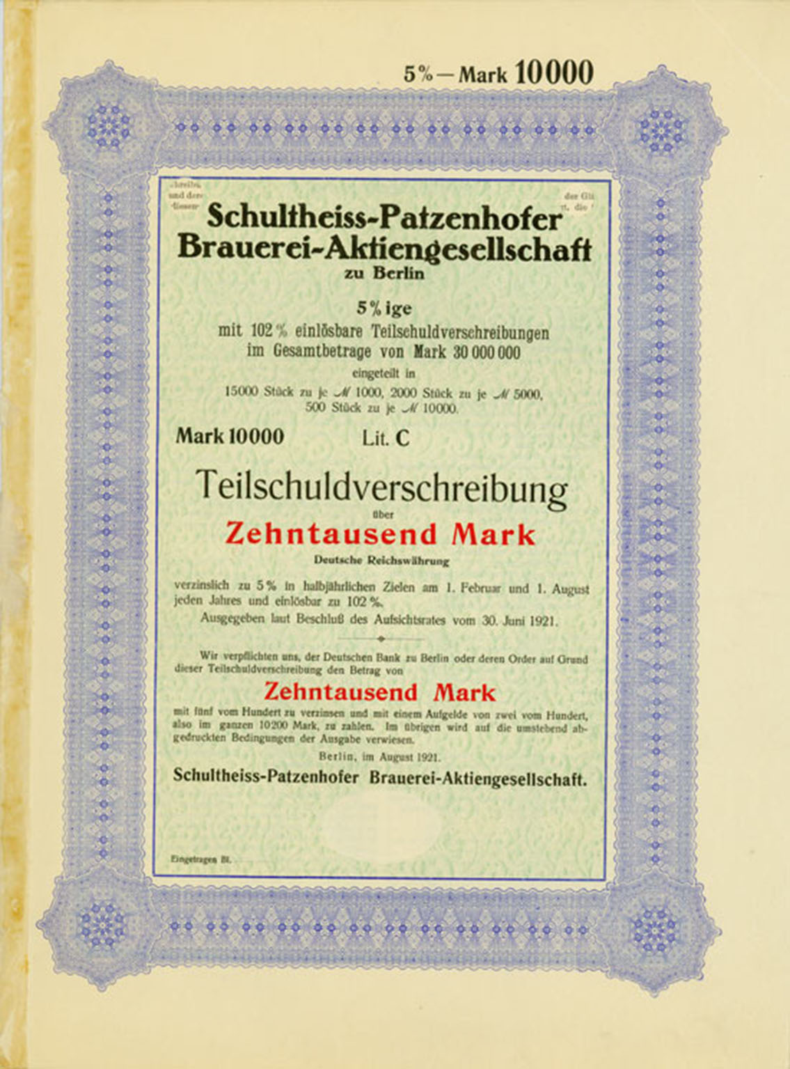 10.000 Mark; Schultheiss-Patzenhofer Brauerei-AG; 5% Teilschuldverschreibung; ausgestellt in Berlin, am 30. Juni 1921; nicht katalogisiert; Wz.: ; Drfa.: |