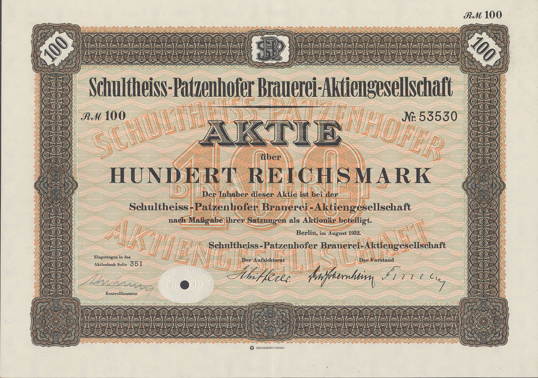 100 Reichsmark; Schultheiss-Patzenhofer Brauerei-AG; ausgestellt in Berlin, im August 1932; SUPPES 2005/06-15416; Wz.: ; Drfa.: Reichsdruckerei; lochentwertet |