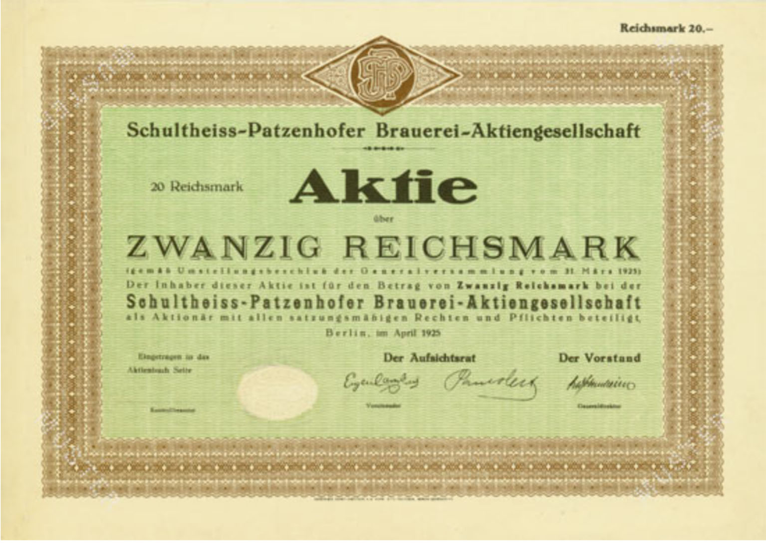 20 Reichsmark; Schultheiss-Patzenhofer Brauerei-AG; ausgestellt in Berlin, im April 1925; SUPPES 2005/06-15415; Wz.: ; Drfa.: |