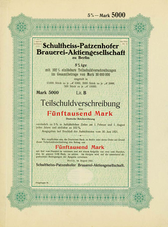 5.000 Mark; Schultheiss-Patzenhofer Brauerei-AG; 5% Teilschuldverschreibung; ausgestellt in Berlin, am 30. Juni 1921; nicht katalogisiert; Wz.: ; Drfa.: |
