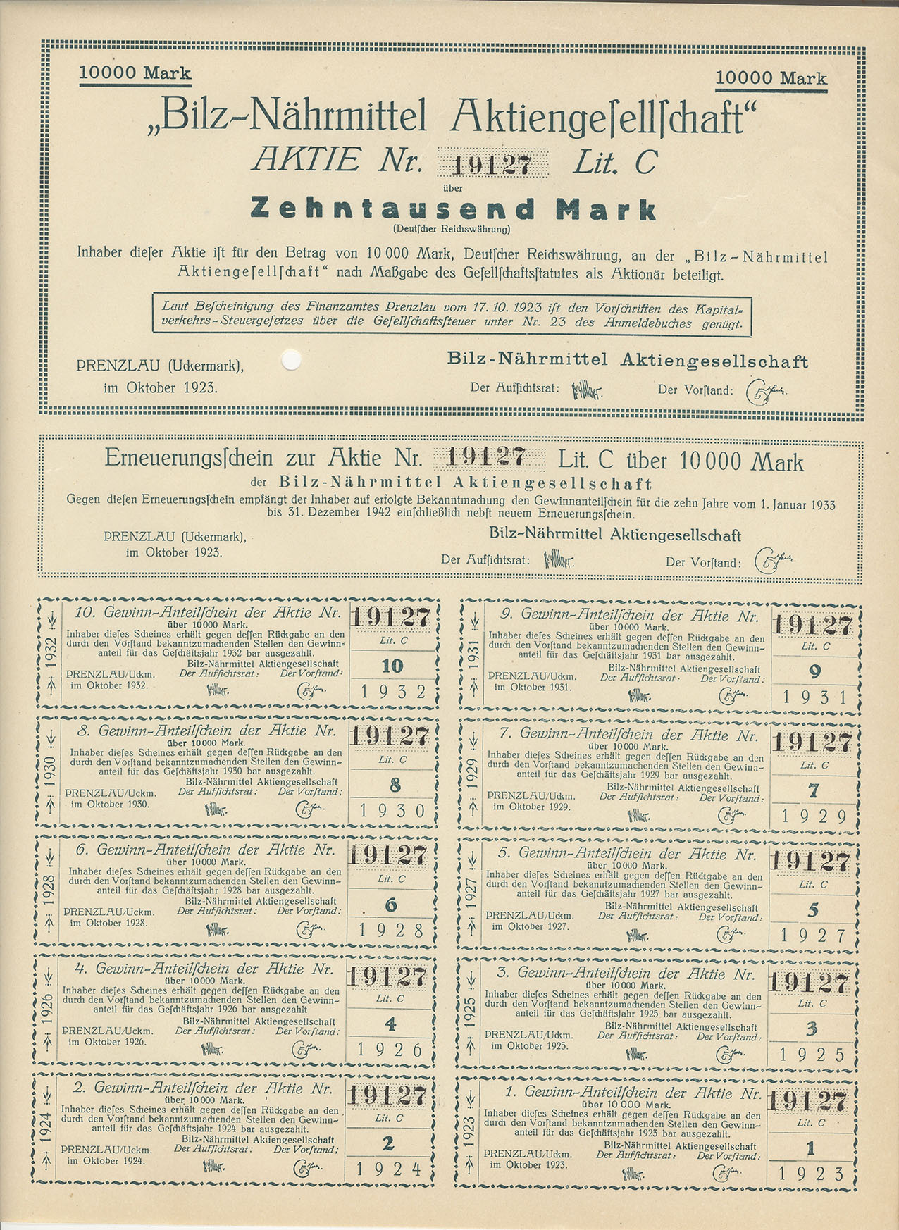 10.000 Mark; Bilz-Nährmittel Aktiengesellschaft; ausgestellt in Prenzlau (Um), im Oktober 1923; nicht katalogisiert; ohne Wz.; mit Erneuerungsscheinen; lochentwertet; ohne Drfa. |