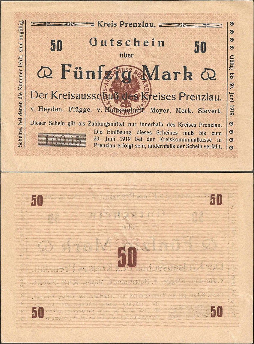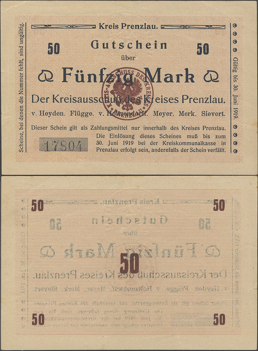 50 Mark 30.06.1919; A. Geiger 428.02 a; Brief-Wz.; mit Präge- u. Farbstempel des Landrates; Rs. Eck-Wertziffer 5mm hoch; ohne Drfa.; hergestellt in der Druckerei Mieck; Auflage: 40.000 Stück = 2.000.000,00M |