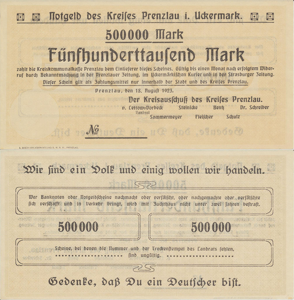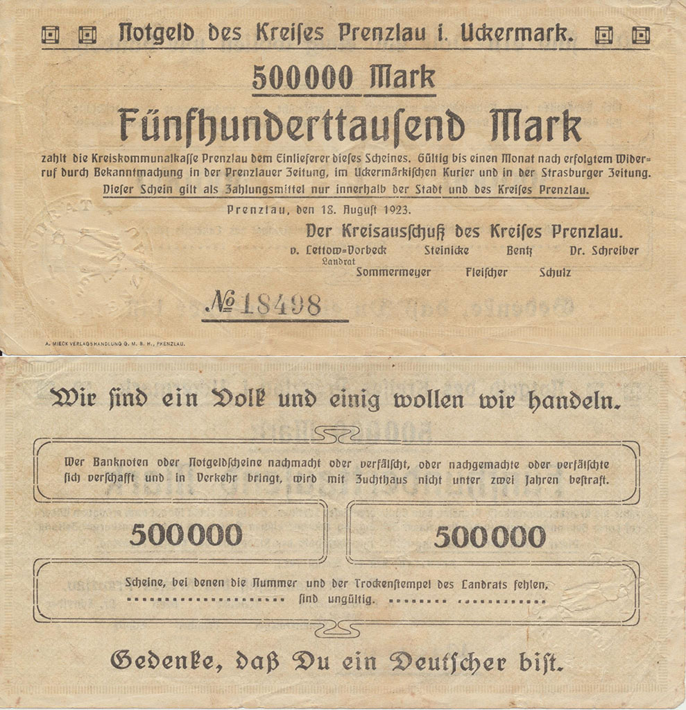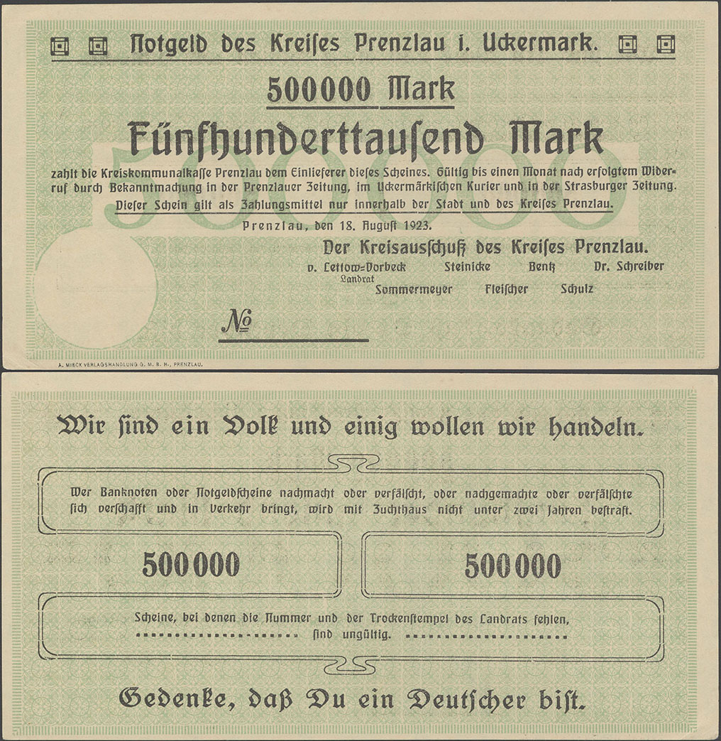 500.000 Mark 18.08.1923; nicht katalogisiert; Wz. Schippen; Rs. WZ 5 Hals steil, 000 schmal oval; ohne KN; Udr. braun / graubraun; ohne Prägestpl.; Drfa.: A. MIECK VERLAGSHANDLUNG G.M.B.H., PRENZLAU, unten links |
