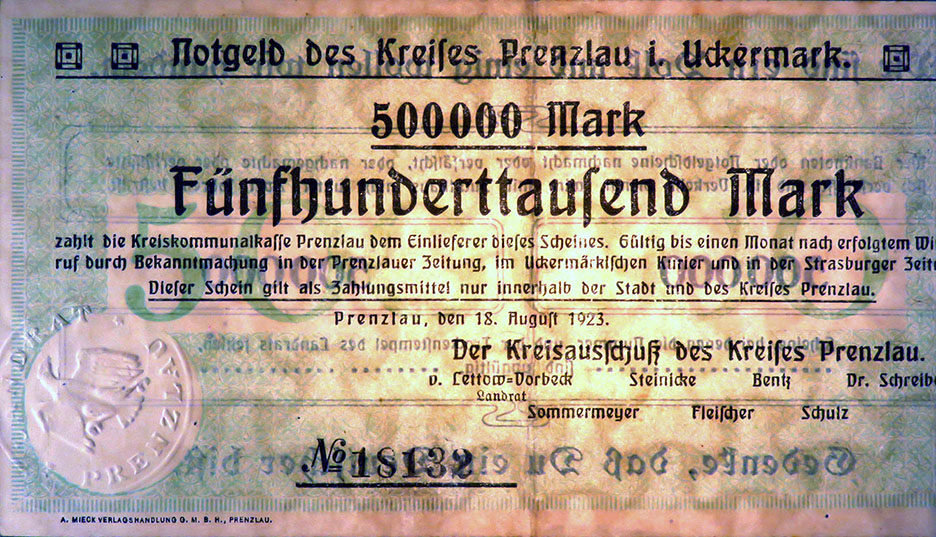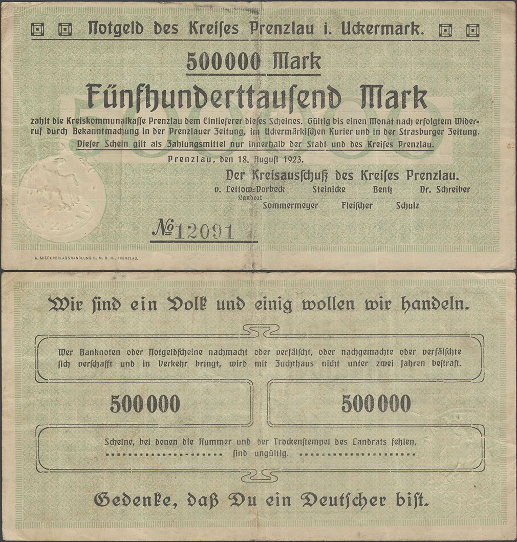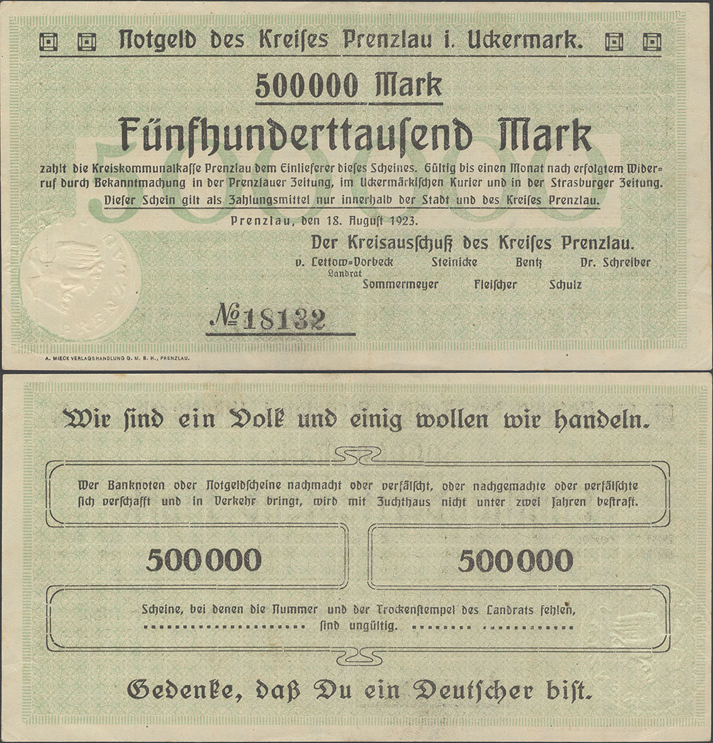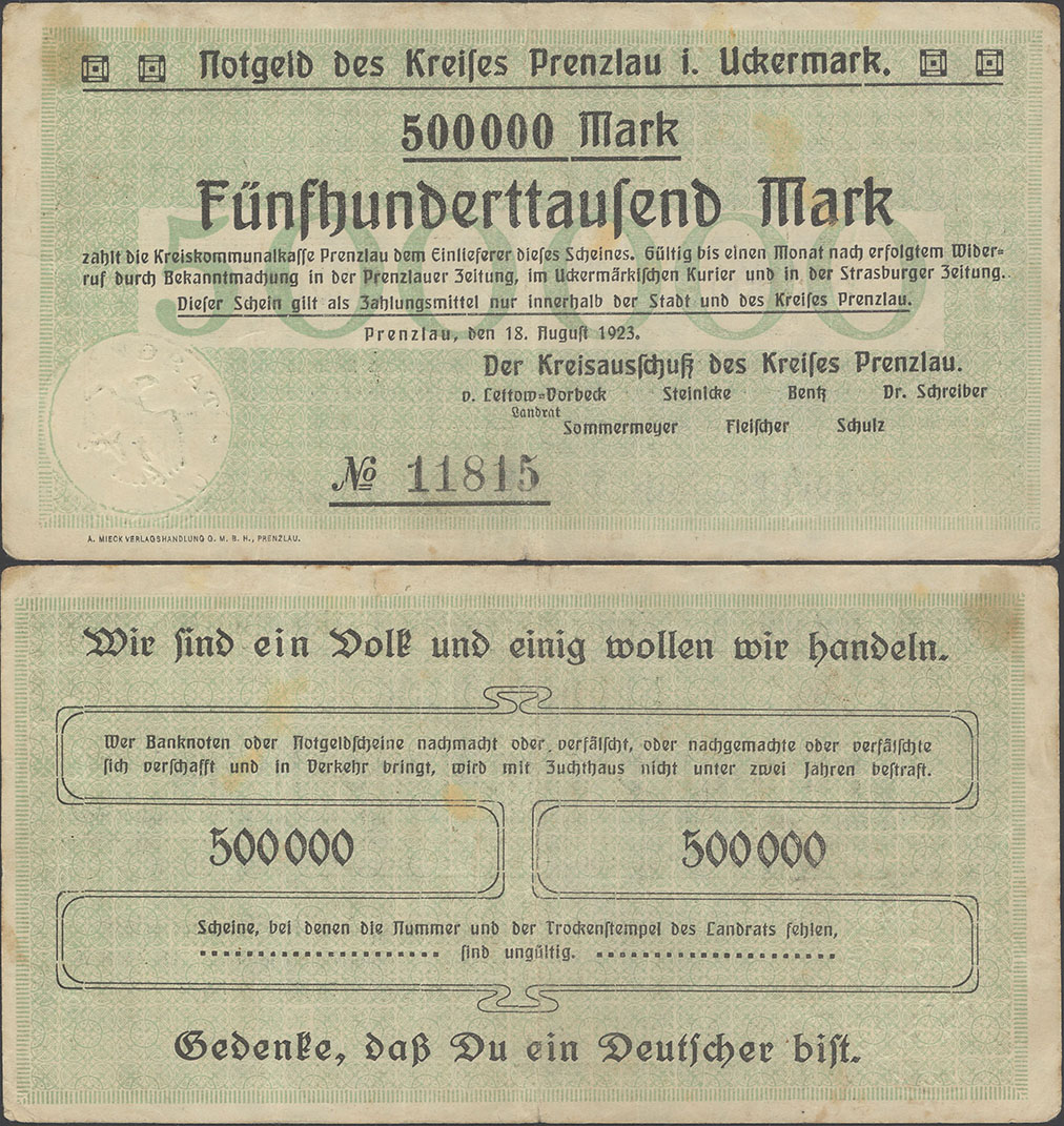 500.000 Mark 18.08.1923; nicht katalogisiert; Wz. Schippen; Rs. WZ 5 Hals steil, 000 schmal oval; ohne KN; Udr. braun / graubraun; ohne Prägestpl.; Drfa.: A. MIECK VERLAGSHANDLUNG G.M.B.H., PRENZLAU, unten links |