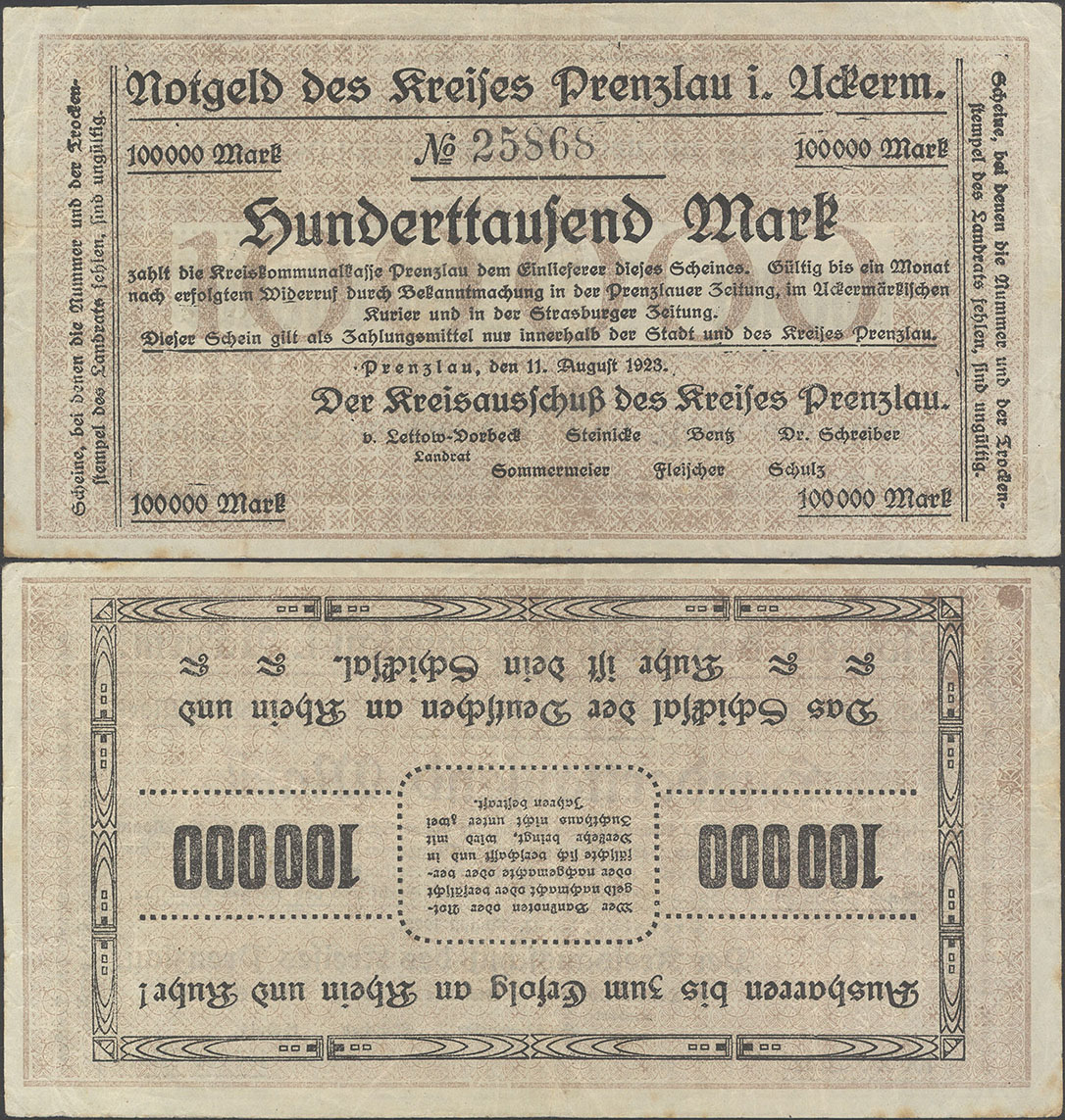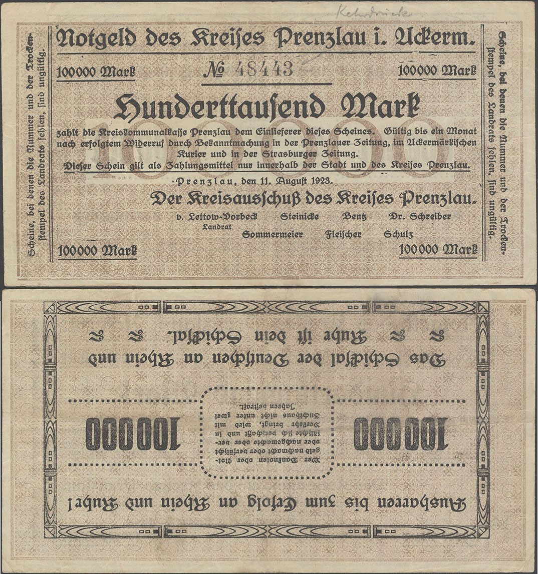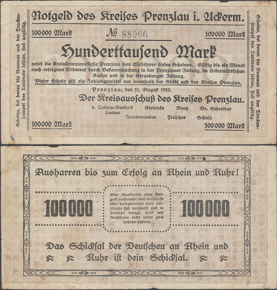 100.000 Mark 11.08.1923; Keller II 4379 a; ohne Wz.; Udr. braun / graubraun; Rs. gleichstehend; KN 4,5mm; ohne Drfa.; hergestellt in der Druckerei Mieck; 1. Auflage: 100 Stück Auflage insgesamt: 100.000 Stück |