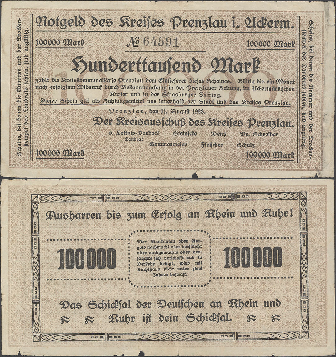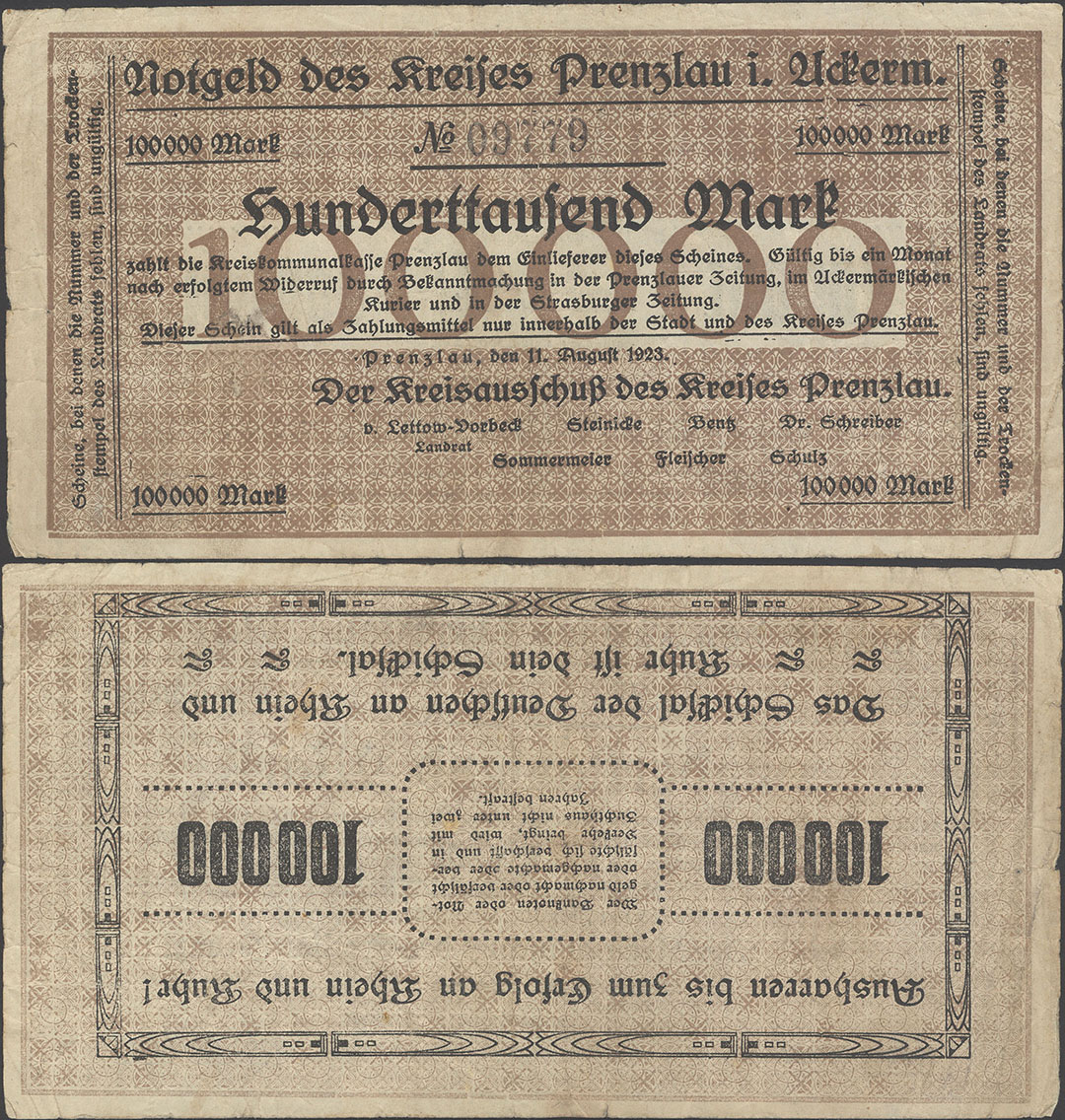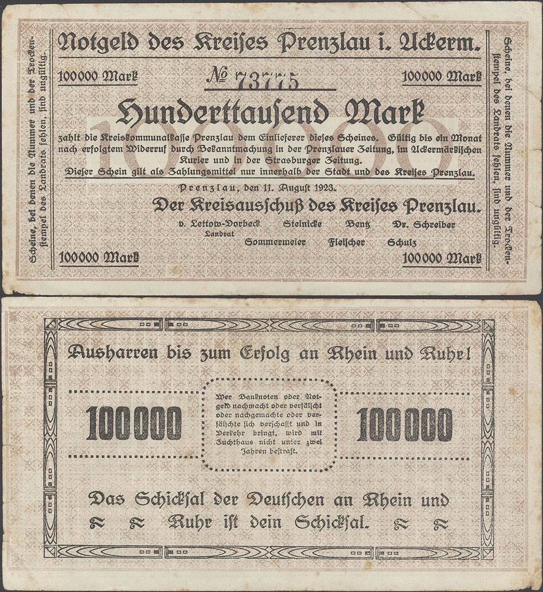 100.000 Mark 11.08.1923; Keller II 4379 a; ohne Wz.; Udr. braun / graubraun; Rs. gleichstehend; KN 4,5mm; ohne Drfa.; hergestellt in der Druckerei Mieck; 1. Auflage: 100 Stück Auflage insgesamt: 100.000 Stück |