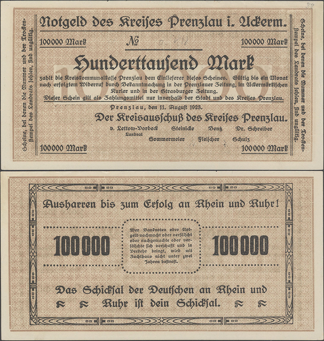 100.000 Mark 11.08.1923; nicht katalogisiert; ohne Wz.; Udr. braun / graubraun; Rs. gleichstehend; ohne KN; ohne Drfa.; hergestellt in der Druckerei Mieck |