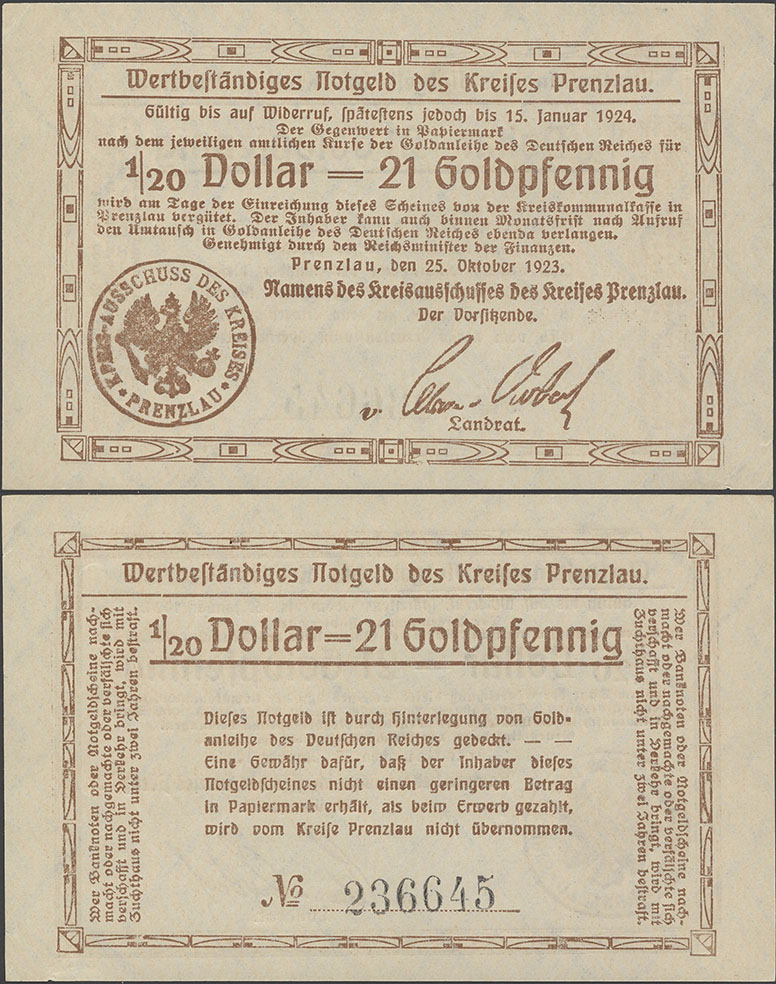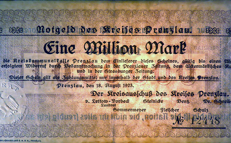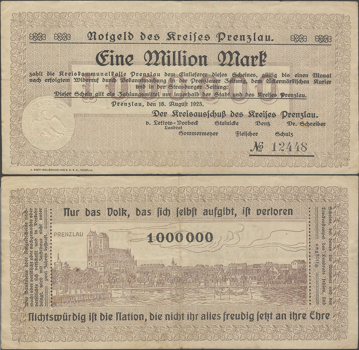 1 Million Mark 18.08.1923; Keller II 4379 c; Wz. Schippen; Rs. 1 steil, 000 oval 5,3mm; KN 5,8mm; Udr. braun / graubraun; Drfa.: A. MIECK VERLAGSHANDLUNG G.M.B.H., PRENZLAU, unten links Auflage insgesamt: 10.000 Stück |