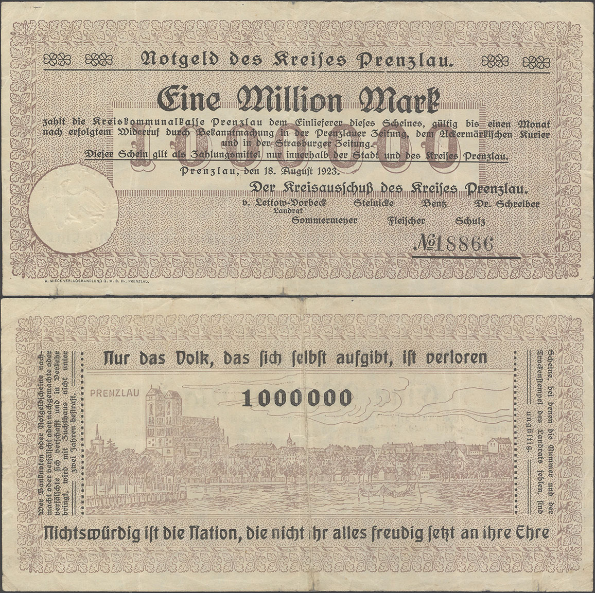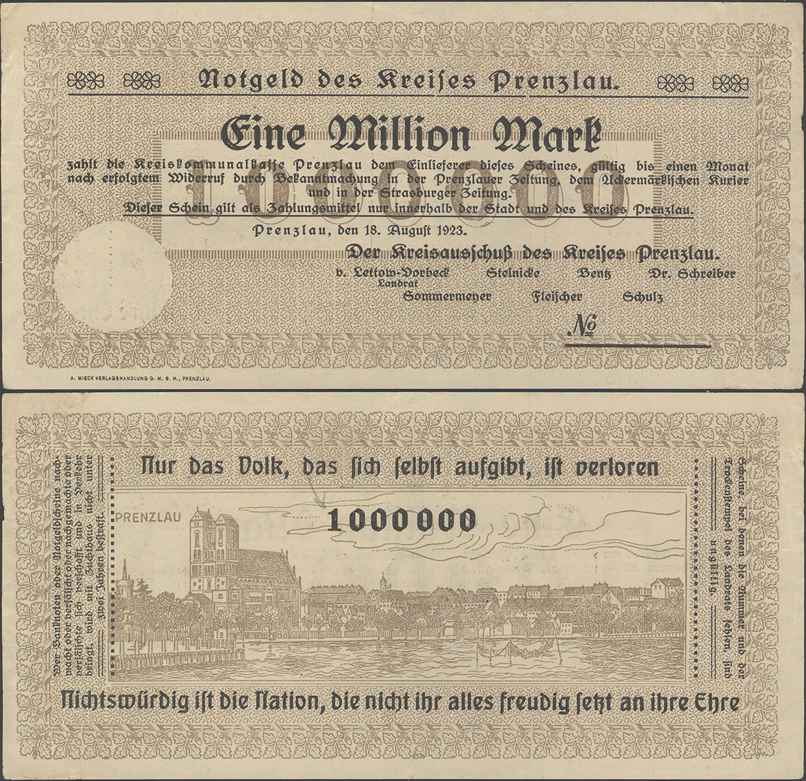 1 Million Mark 18.08.1923; nicht katalogisiert; Wz. Schippen; Rs. 1 steil, 000 oval 5,3mm; ohne KN; Udr. braun / graubraun; Drfa.: A. MIECK VERLAGSHANDLUNG G.M.B.H., PRENZLAU, unten links |