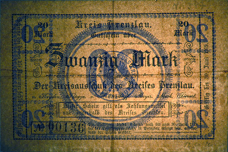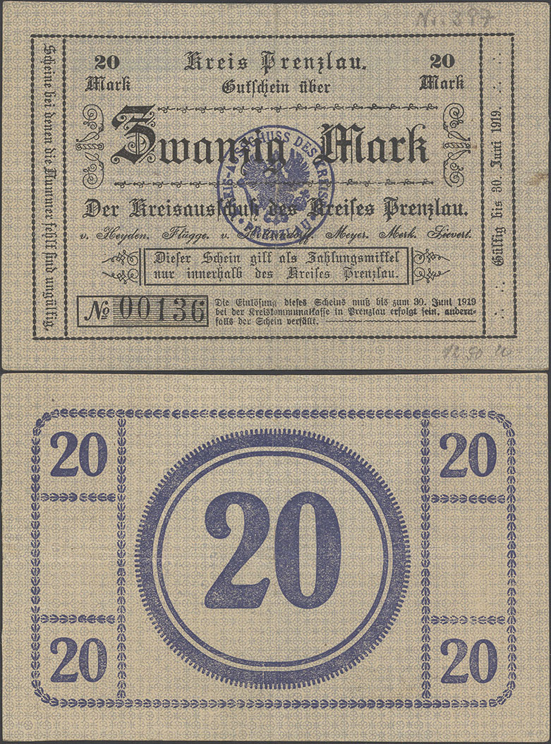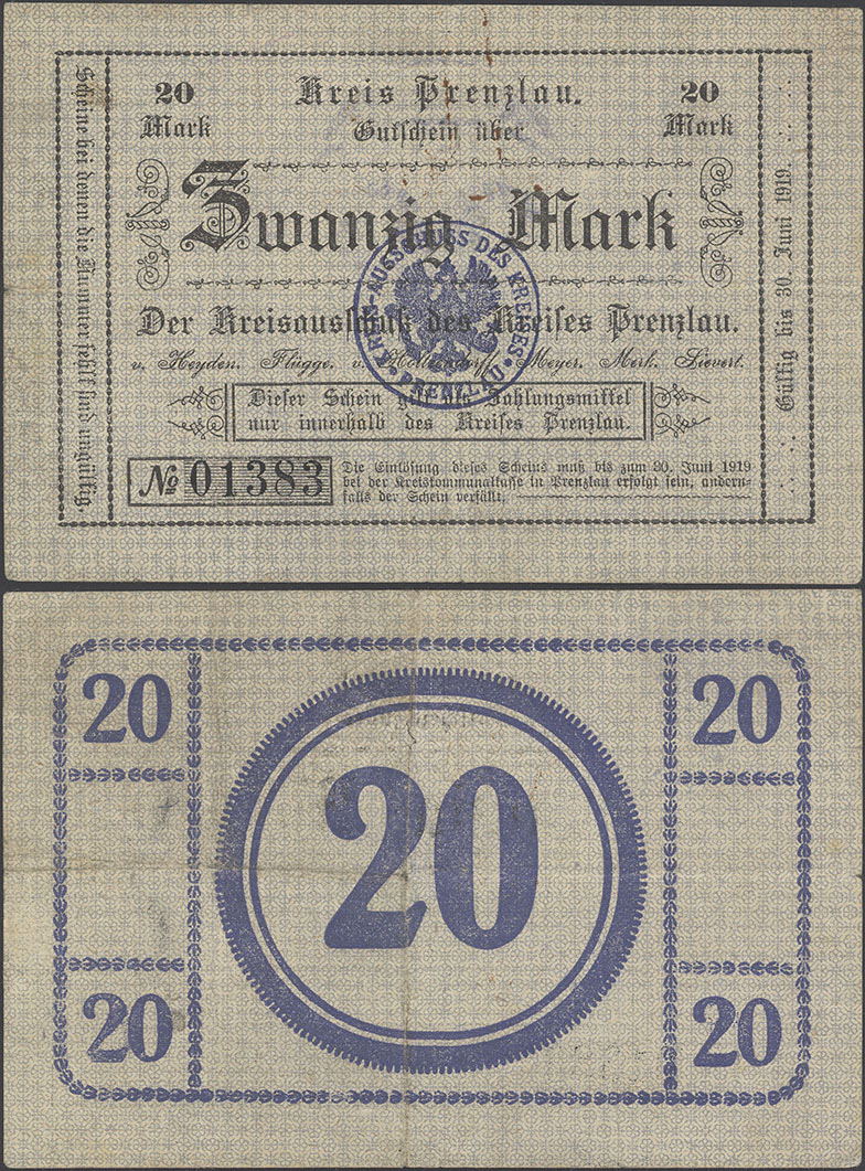 20 Mark 30.06.1919; A. Geiger 428.01 a; Brief-Wz.; mit Präge- u. Farbstempel des Landrates; ohne Drfa.; hergestellt in der Druckerei Vincent; Auflage: 25.000Stück = 500.000,00M |