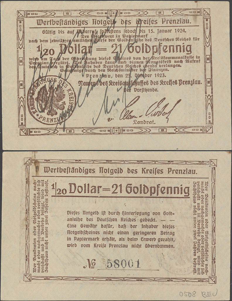 500.000 Mark 18.08.1923; nicht katalogisiert; Wz. Schippen; Rs. WZ 5 Hals steil, 000 schmal oval; Udr. braun / graubraun; ohne KN; ohne Prägestempel; Drfa.: A. MIECK VERLAGSHANDLUNG G.M.B.H., PRENZLAU, unten links |