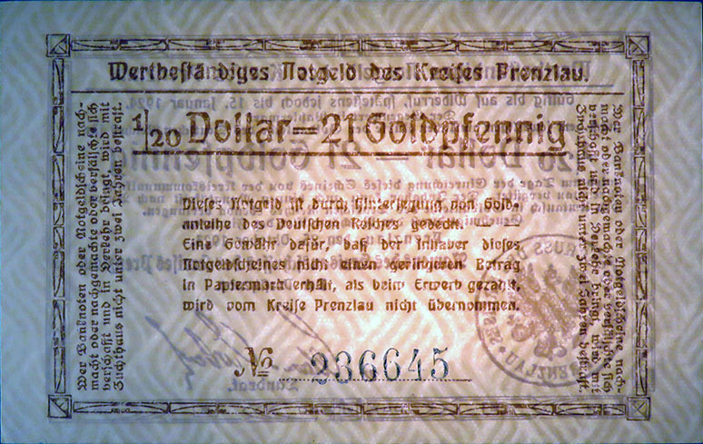 20 Mark 30.06.1919; A. Geiger 428.01 b; Brief-Wz.; nur Farbstempel; ohne Drfa.; hergestellt in der Druckerei Vincent; Als Fälschung doppelt ausgegebener Schein. |