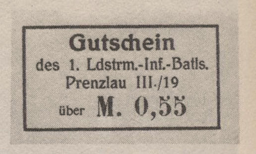55 Pfennig ohne Datum; Keller I. - III. 2086 a; Vs.: Gutschein / des 1. Ldstrm.-Inf.-Batls. / Prenzlau III./19 / über M. 0,55; Rs.: leer; Löhnung für 1 Tag; Karton |