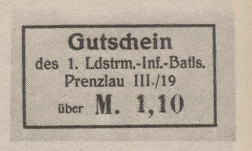 1,10 Mark ohne Datum; Keller I. - III. 2086 a; Vs.: Gutschein / des 1. Ldstrm.-Inf.-Batls. / Prenzlau III./19 / über M. 1,10; Rs.: leer; Löhnung für 2 Tage; Karton |