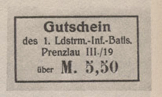 5,50 Mark ohne Datum; Keller I. - III. 2086 a; Vs.: Gutschein / des 1. Ldstrm.-Inf.-Batls. / Prenzlau III./19 / über M. 5,50; Rs.: leer; Löhnung für 10 Tage; Karton |