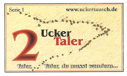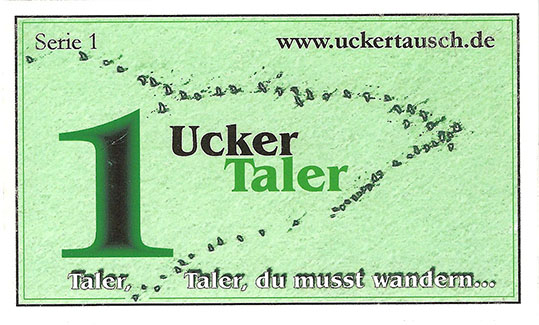 Der Tauschring UckerTausch wurde 2007 gegründet und ist in den Regionen Prenzlau, Pasewalk, Löcknitz, Penkun und seit 2012 auch in Templin/Flieth aktiv. Fünf Minuten haben den Wert von 1 UckerTaler. UckerTaler gibt es als Scheine oder werden über die Konten verrechnet. |