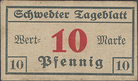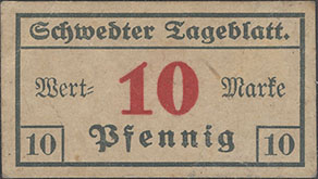 10 Pfennig ohne Datum; Keller 2338 I; Vs.: Schwedter Tageblatt / Wert= 10 Marke / 10 Pfennig 10; Rs.: leer; Kartonpapier weiß; schmales "g" in Tageblatt und Pfennig; ohne Drfa. |