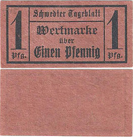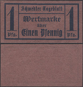 1 Pfennig ohne Datum; Keller 2338; Vs.: links und rechts: 1 Pfg. und in der Mitte: Schwedter Tageblatt / Wertmarke / über / Einen Pfennig; Rs.: leer; Kartonpapier; ohne Drfa. |