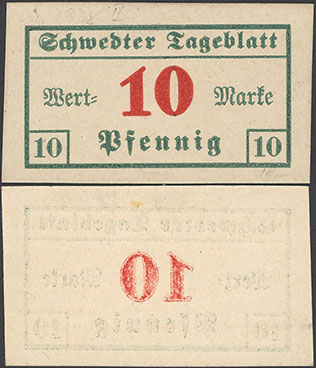 10 Pfennig ohne Datum; Keller 2338 III; Vs.: Schwedter Tageblatt. / Wert= 10 Marke / 10 Pfennig 10; Rs.: leer; Kartonpapier sämisch; breites "g" in Tageblatt und Pfennig; Druck dunkler grün; ohne Drfa. |