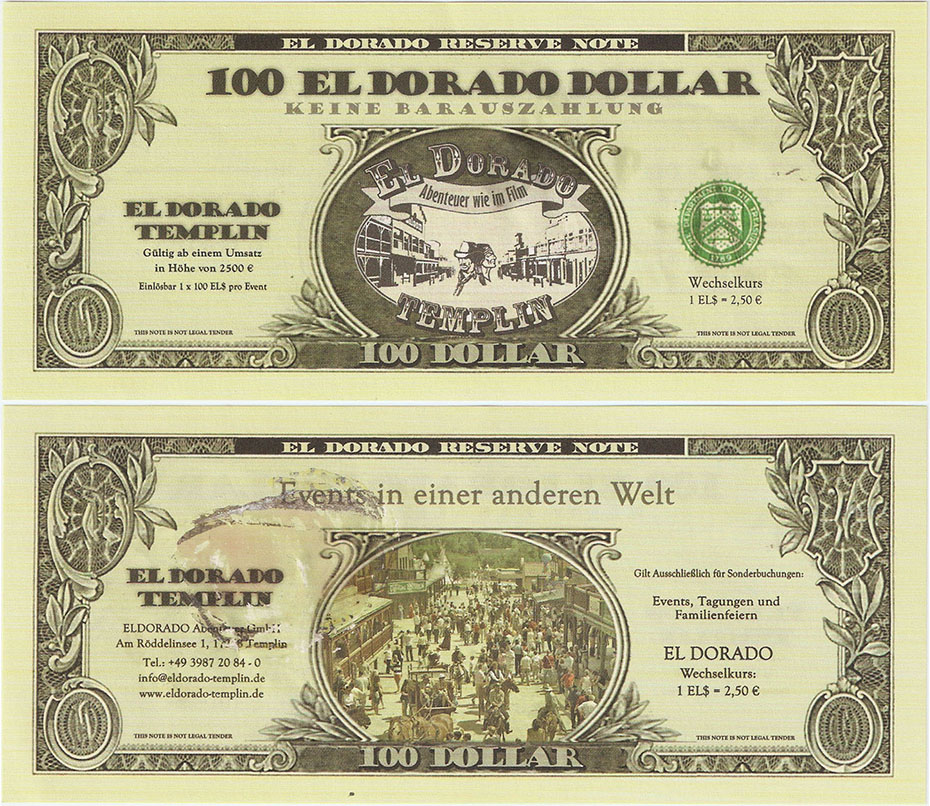 100 Dollar o.J. (2016); nicht katalogisiert; Vs.: 100 EL DORADO DOLLAR, mittig: El Dorado-Bild, links: EL DORADO / TEMPLIN und rechts Wechselkurs; Rs.: Events in einer anderen Welt, mittig: El Dorado-Bild, links: EL DORADO / TEMPLIN und rechts Wechselkurs; ohne Drfa.; ohne Wz.; Wert in der Westernstadt El Dorado Templin 1EL$ = 2,50€ Ausschließlich für Sonderbuchungen, Tagungen und Familienfeiern |