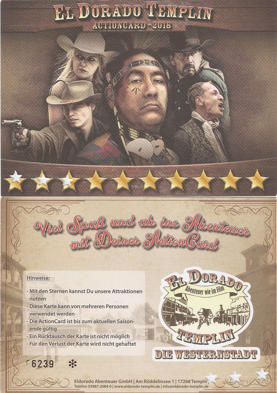 20 Euro Actionscard 2018; nicht katalogsiert; Vs.: oben EL DORADO TEMPLIN / ACTIONSCARD - 2018 / Bildnis / zehn fünfzackige Sterne; Rs.: Kn 5 stellig mit sechsstraligem Stern, Spruch und Hinweise; ohne Drfa.; ohne Wz.; Wert in der Westernstadt El Dorado Templin = 20,00€; die zehn Sterne können einzeln entwertet werden |