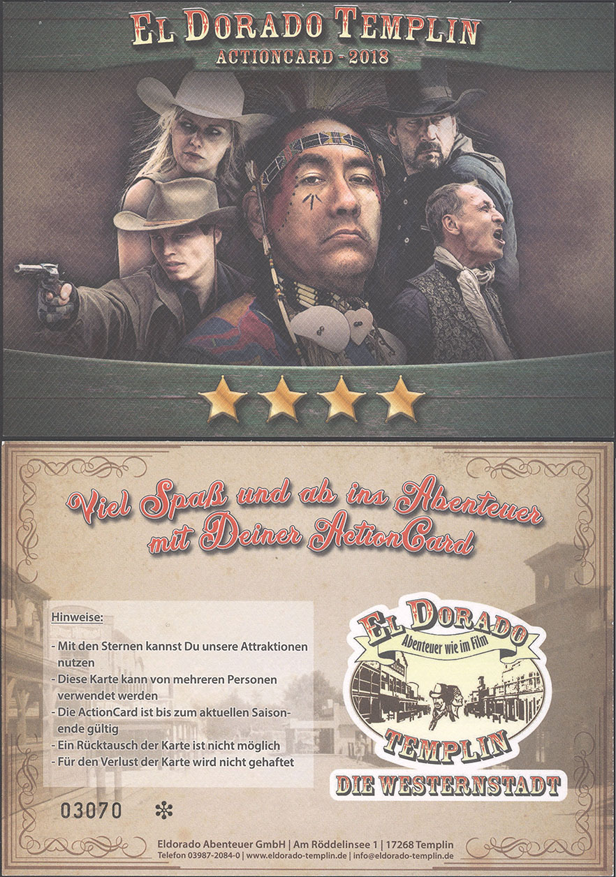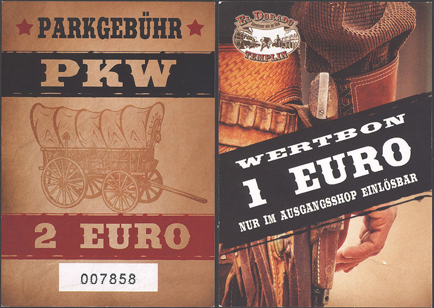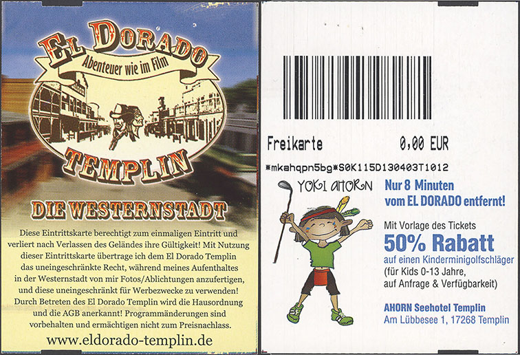 0,00Euro; 2018; nicht katalogisiert; Vs.: EL DORADO / Abenteuer wie im Film / Bild / TEMPLIN / DIE WESTERNSTADT / Text; Rs.: Strichcode / Freikarte 0,00EUR / Rabatt-Werbung; ohne Wz.; ohne Drfa. |