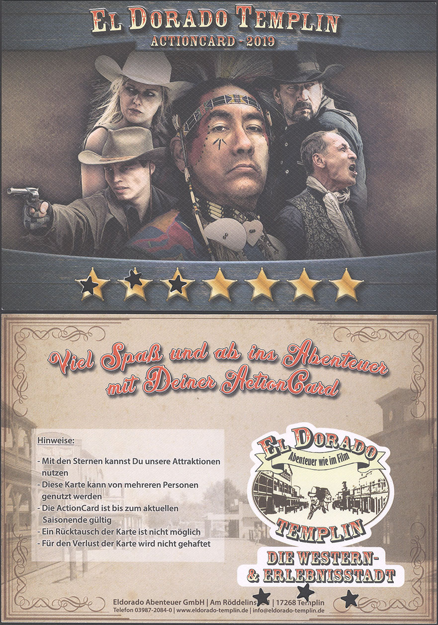 15 Euro Actionscard 2019; nicht katalogsiert; Vs.: oben EL DORADO TEMPLIN / ACTIONSCARD - 2019 / Bildnis / sieben fünfzackige Sterne; Rs.: Kn 5 stellig mit sechsstraligem Stern, Spruch und Hinweise; ohne Drfa.; ohne Wz.; Wert in der Westernstadt El Dorado Templin = 15,00€; die sieben Sterne können einzeln entwertet werden |