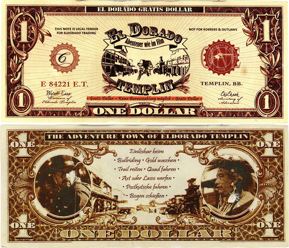 1 Dollar; o.J.; nicht katalogisiert; Vs.: "ELDORADO / Abenteuer wie im Film"; Rs.: ADVENTURE TOWN OF ELDORADO TEMPLIN; ohne Drfa.; ohne Wz.; Wert in der Westernstadt El Dorado Templin = 0€ Sympathiedollar, der vom El Dorado-Team oder Schaustellern an Besucher verschenkt wurde |