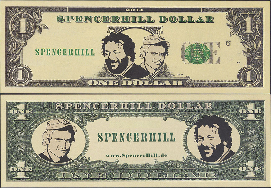 1 Spencer Hill Dollar; o. J. (2014); nicht katalogisiert; Vs.: "1 SPENCER HILL DOLLAR" und Bildnisse von Bud Spencer und Terence Hill; Rs.: "BUD SPENCER & TERENCE HILL"; ohne Drfa.; ohne Wz.; Fehldruck |