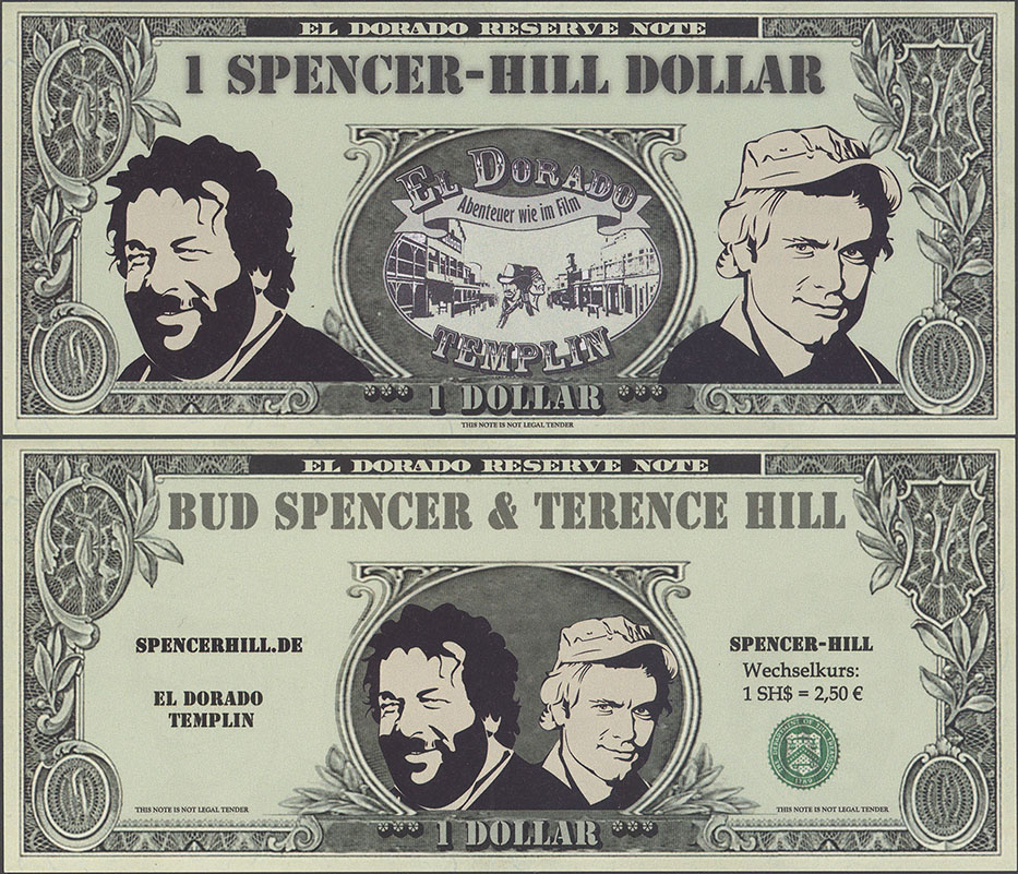 1 Spencer Hill Dollar; o. J. (2014); nicht katalogisiert; Sonderausgabe zum 1. Jahrestreffen der Spencer-Hill Fans vom 28.08.-31.08.2014 im Eldorado Templin; Vs.: "1 SPENCER HILL DOLLAR" und Bildnisse von Bud Spencer und Terence Hill; Rs.: "BUD SPENCER & TERENCE HILL"; ohne Drfa.; ohne Wz.; Wert in der Westernstadt El Dorado Templin 1SH$ = 2,50€ |