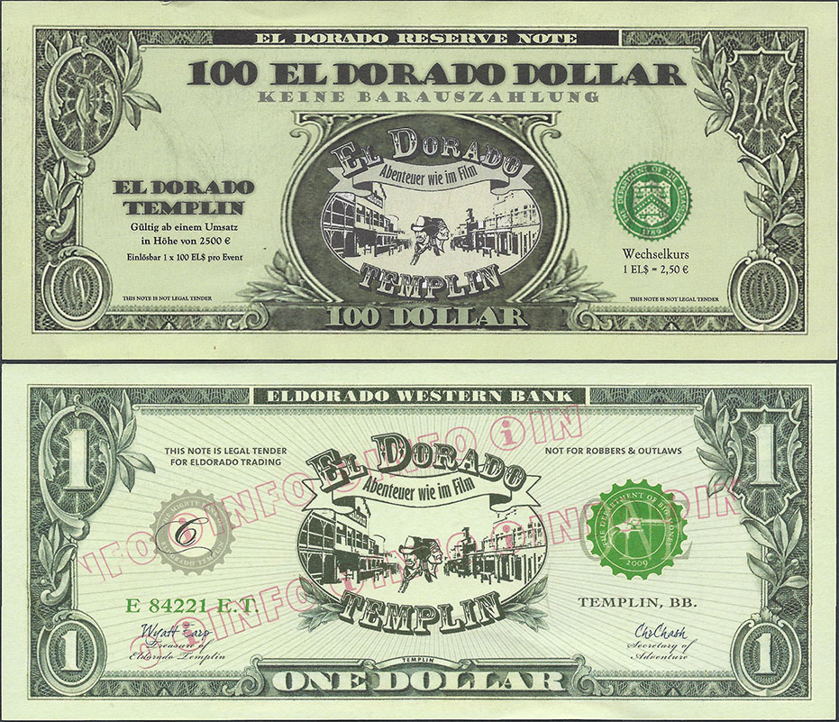 100 Dollar o.J. (2016); nicht katalogisiert; Vs.: 100 EL DORADO DOLLAR, mittig: El Dorado-Bild, links: EL DORADO / TEMPLIN und rechts Wechselkurs; Rs.: mit INFO überstempelt; ohne Drfa.; ohne Wz.; Wert in der Westernstadt El Dorado Templin 1EL$ = 2,50€; Musterschein |
