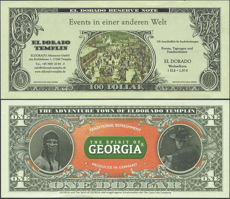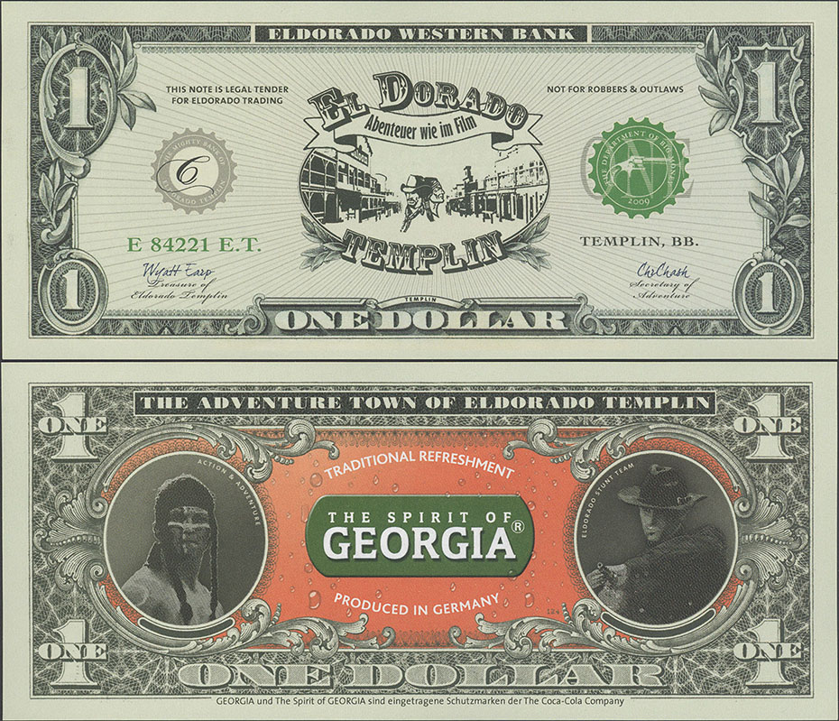 1 Dollar; o.J. (2009); nicht katalogisiert; Vs.: "ELDORADO WESTERNBANK"; Rs.: Coca-Cola Werbung: "THE SPIRIT OF GEORGIA"; ohne Drfa.; ohne Wz.; Wert in der Westernstadt El Dorado Templin = 0€ |