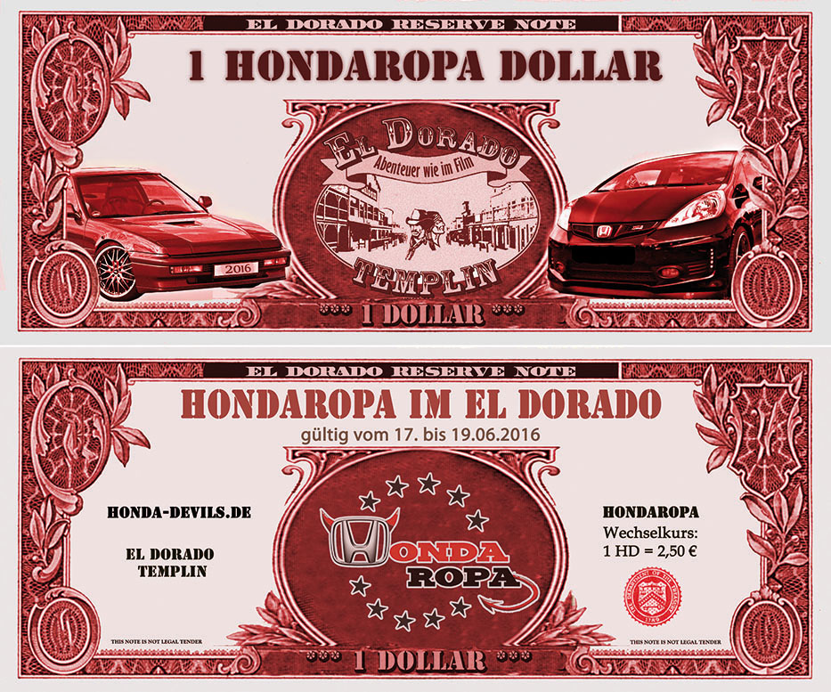 ![]() | 1 Dollar o.J. (2016); Hondaropa 17.-19. Juni 2016; nicht katalogisiert; Vs.: 1 HONDAROPA DOLLAR, mittig: El Dorado-Bild, links und rechts Honda-Bilder; Rs.: "HONDAROPA IM EL DORADO" gültig vom 17. bis 19.06.2016; ohne Drfa.; ohne Wz.; Wert in der Westernstadt El Dorado Templin 1HD = 2,50€ |