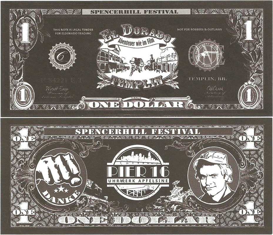 1 Dollar o.J. (2016); nicht katalogisiert; Sonderausgabe zum Jahrestreffen der Spencer-Hill Fans am 15.09.2016; Vs.: SPENCERHILL FESTIVAL / EL DORADO / Abentuer wie im Film / ONE DOLLAR; Rs.: SPENCERHILL FESTIVAL / PIER 16 / URWERK APFELSINE / ONE DOLLAR; ohne Drfa.; ohne Wz.; Wert in der Westernstadt El Dorado Templin = 0€ Trauerausgabe für Bud Spencer (31.10.1929-27.06.2016), der kurz vor dem Treffen verstorben war. |