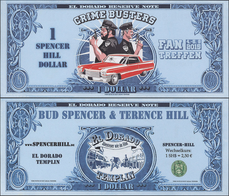 1 Spencer Hill Dollar; o. J. (2015); nicht katalogisiert; Sonderausgabe zum Jahrestreffen der Spencer-Hill Fans 4.-5.9.2015; Vs.: "1 SPENCER HILL DOLLAR"; Rs.: "BUD SPENCER & TERENCE HILL"; ohne Drfa.; ohne Wz.; Wert in der Westernstadt El Dorado Templin 1SH$ = 2,50€ |