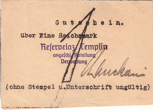 1 Reichsmark o. J. (1942); Lindmann ; Vs.: maschinenschriftlich: "Gutschein. über Eine Reichsmark (ohne Stempel u.Unterschrift ungültig)" Stempel: "Reservelaz. Templin angeschl. Abteilung Verwaltung" Rs.: leer; o. Wz.; handschriftliche Unterschrift |