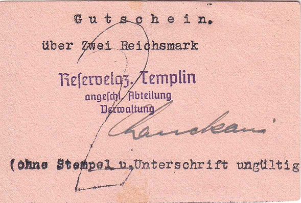 2 Reichsmark o. J. (1942); Lindmann ; Vs.: maschinenschriftlich: "Gutschein. über Zwei Reichsmark (ohne Stempel u.Unterschrift ungültig" Stempel: "Reservelaz. Templin angeschl. Abteilung Verwaltung" Rs.: leer; o. Wz.; handschriftliche Unterschrift |