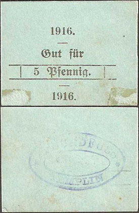 5 Pfennig 1916; Keller 2476 a; Schoenawa 109.C.1.; Vs.: 1916. / - / Gut für / 5 Pfennig. / - / 1916.; Rs. Stempel A. Bundfuss und 8 weitere Firmen; ohne Drfa. |