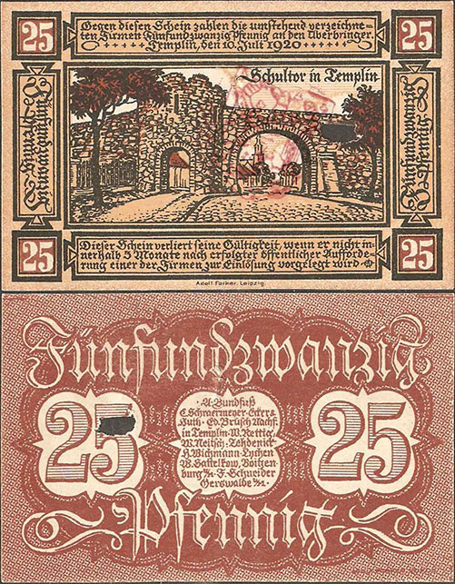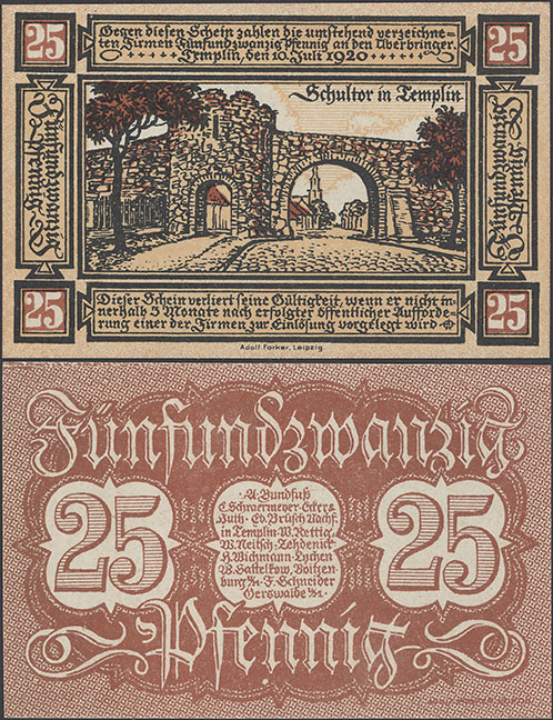 25 Pfennig 10.07.1920; Keller 2476 b; Schoenawa 109.C.3.; Drfa.: Adolf Forker, Leipzig, unten mittig; rückseitig sind die Firmen: A. Bundfuß, C. Schraermeyer, Ecker & Huth, Ed. Brüsch Nachf. in Templin, W. Rettig, W. Neitsch : Zehdenick, H. Wichmann Lychen, W. Sattelkow, Boitzenburg UM, F. Schneider, Gerswalde UM aufgeführt |