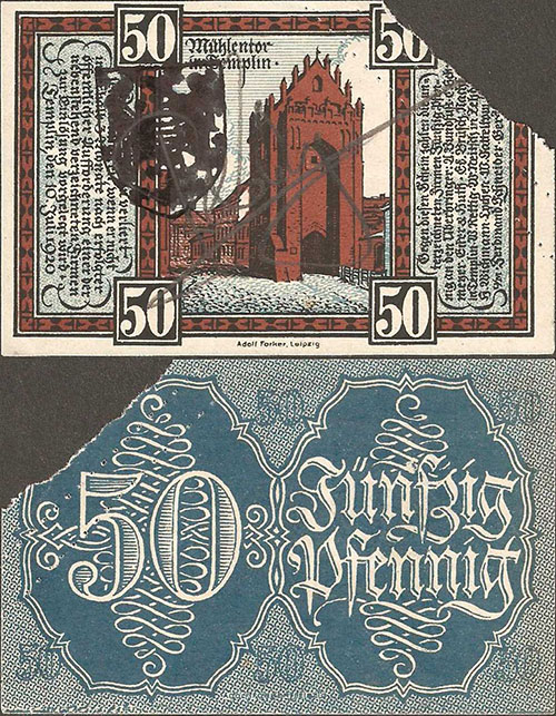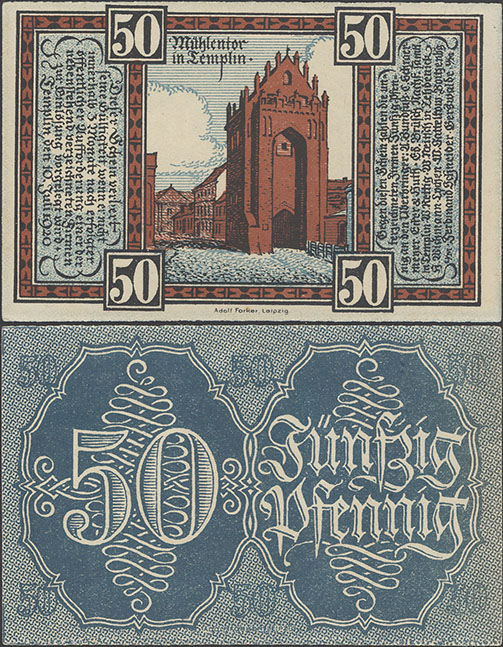50 Pfennig 10.07.1920; nicht katalogisiert; Schoenawa 109.C.4.; Drfa.: Adolf Forker, Leipzig, unten mittig entwertet durch Schnitt und durchkreuzt mit handschriftlicher Unterschrift des Bürgermeisters rechts auf der Vorderseite sind die Firmen: A. Bundfuß, C. Schraermeyer, Ecker & Huth, Ed. Brüsch Nachf. sämtl. in Templin, W. Rettig, W. Neitsch in Zehdenick, H. Wichmann Lychen, W. Sattelkow, Boitzenbg UM, Ferdinand Schneider, Gerswalde UM aufgeführt |